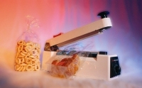 The sealer is hand operated and performs a ribbon seal plus cut by means of a sliding knife. Sealing time is regulated by timer and shown by a red lamp.